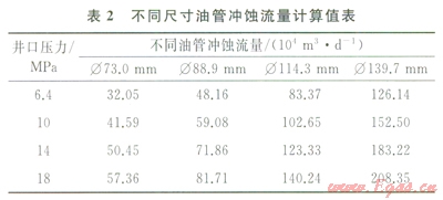 高速流動(dòng)的氣體在金屬表面上運(yùn)動(dòng),在氣體雜質(zhì)機(jī)械磨損與腐蝕介質(zhì)的共同作用下,會(huì)使油管腐蝕加速。實(shí)踐表明,氣體流速超過21.3m/s時(shí),管柱沖蝕趨于嚴(yán)重。儲(chǔ)氣庫注采井運(yùn)行過程中井口壓力為整個(gè)井筒壓力分布的最低點(diǎn),沖蝕分析選擇井口為研究點(diǎn)。表2是不同油管在對應(yīng)井口壓力下的沖蝕流量[6-8]。