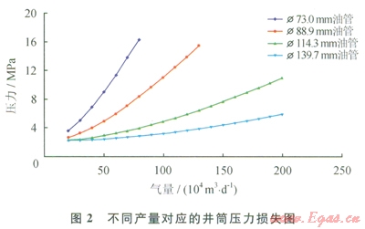 儲(chǔ)氣庫注采井產(chǎn)能高,油管對產(chǎn)量敏感。以無阻流量200×104m3/d的氣井為例,Æ114.3mm及以下尺寸的油管,隨著氣量的增加,井筒壓力損失增加明顯(圖2)。