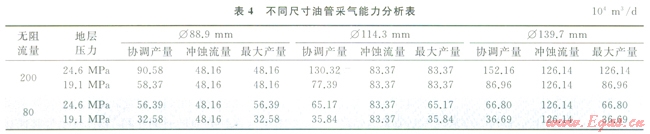 如表4所示,無阻流量為200×104m3/d時(shí),采用Æ139.7mm可以滿足86×104~126×104m3/d的采氣要求;無阻流量為80×104m3/d時(shí),采用Æll4.3mm可以滿足35×104~65×104m3/d的采氣要求。