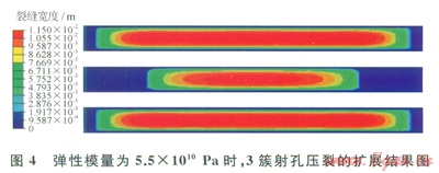 儲層的彈性模量增大,壓裂裂縫寬度降低,這樣會降低射孔簇間的干擾,增加中間射孔簇壓裂裂縫的長度。圖4所示的是3簇射孔、彈性模量為5.5×1010Pa時的裂縫擴展情況,圖2-b所示的是3簇射孔、彈性模量為3.5×1010Pa時的裂縫擴展情況,可以發(fā)現(xiàn):儲層彈性模量增大2.0×1010Pa時,中間射孔簇的裂縫長度增加了53.0m,中間裂縫形成了有效裂縫。
