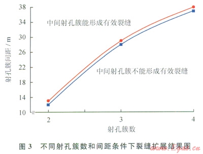 假設中間射孔簇形成的壓裂裂縫長度達到兩端裂縫的一半以上,認為中間裂縫形成了有效裂縫。不同射孔簇數(shù)、簇間距條件下的裂縫擴展情況如圖3所示,從圖3可以看出:射孔簇數(shù)增加,能形成有效裂縫的極限間距增加,且增加幅度較大;射孔簇數(shù)為2簇,極限干擾距離為13.0m;射孔簇數(shù)增加到4簇,極限十擾距離增加到38.0m。