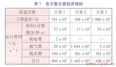 按照各方案的系統(tǒng)設備組成估算造價,同時結合各方案的運行要求,測算年水、電、氣的消耗費用。各方案主要經(jīng)濟指標見表1。