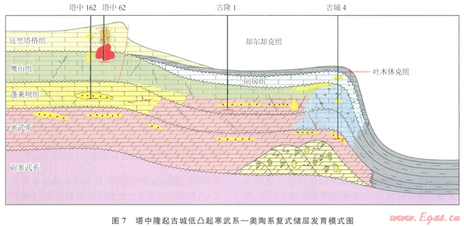 塔中62井奧陶系良里塔格組礁灘體凝析氣田的發(fā)現(xiàn)[1],促使古城低凸起的勘探思路發(fā)生重大變革;古城地區(qū)也可能具備發(fā)育臺緣帶的沉積環(huán)境和地質(zhì)條件,由此勘探思路由海相碎屑巖勘探向深層奧陶系臺緣帶勘探轉(zhuǎn)變。
