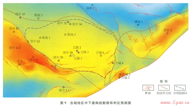 古城地區(qū)下古生界碳酸鹽巖具有良好的生儲蓋組合空間配置與有利的古構(gòu)造發(fā)育背景,石油地質(zhì)條件優(yōu)越。該中下奧陶統(tǒng)發(fā)育層間巖溶優(yōu)越,與卜覆奧陶系卻爾卻克組巨厚泥巖構(gòu)成優(yōu)質(zhì)儲蓋組合;且處于加里東期以來長期繼承性古隆起斜坡高部位,同時處于寒武系—中下奧陶統(tǒng)的盆地相優(yōu)質(zhì)烴源巖有利分布區(qū),可俘獲早期油氣與晚期裂解氣,成藏條件有利。古城6井的突破,證實了該區(qū)的勘探潛力,是繼塔中、塔北之后的又一個碳酸鹽巖勘探領(lǐng)域,古城地區(qū)下古生界碳酸鹽巖7000m埋深(海拔-6000m)可探面積約1.2×104km2,勘探前景廣闊(圖9)。