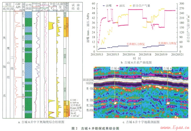 古城6井于2012年5月15日,在奧陶系鷹山組鷹3段6144~6169m井段完井試油,用8mm油嘴放噴求產(chǎn),油壓30.4MPa,折合日產(chǎn)氣26.4234×104m3,測試結(jié)論為氣層;從試采曲線上可以看出,油壓穩(wěn)定,顯示具有充足的地層供液能力(圖2-b)。
