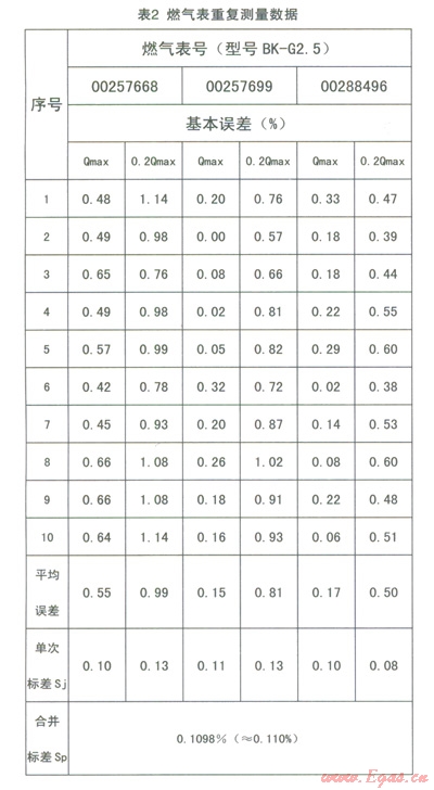 取三臺(tái)B級(jí)BK-G2.5型的皮膜式燃?xì)獗恚x擇Qmax(4.0m3/h)和0.2Qmax(0.8m3/h)兩個(gè)流量點(diǎn)連續(xù)測(cè)量10次得到6組測(cè)量數(shù)據(jù)(見表2),計(jì)算每組測(cè)量列的平均誤差di,然后按照貝賽爾公式可以算出每組測(cè)量列的單次實(shí)驗(yàn)標(biāo)準(zhǔn)差Sj,再推算出6組實(shí)驗(yàn)標(biāo)準(zhǔn)差的合并樣本標(biāo)準(zhǔn)差Sp,則有:u(v1)=Sp