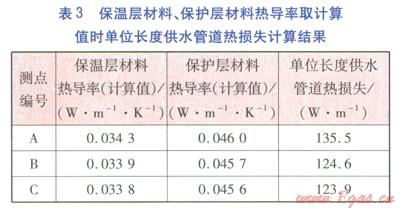 對(duì)不同測(cè)點(diǎn)的供水溫度、管道外表面溫度進(jìn)行實(shí)測(cè),對(duì)供水管道熱損失進(jìn)行計(jì)算,分析保溫層材料、保護(hù)層材料熱導(dǎo)率對(duì)計(jì)算結(jié)果的影響。對(duì)測(cè)試管段起點(diǎn)、終點(diǎn)供水溫度進(jìn)行測(cè)量,計(jì)算供水沿程溫降。