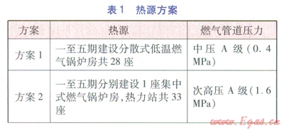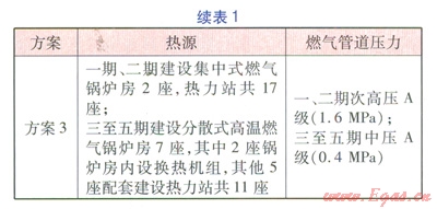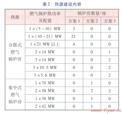 一般而言,熱源方案的確定是以“保障供熱安全,技術工藝合理,工程投資經濟,環(huán)保效益突出”為原則,從區(qū)域總體規(guī)劃及大氣污染治理的總體要求出發(fā),從技術、經濟、工程實施可行性等多角度進行比選。針對本工程的區(qū)域特點,在常規(guī)的比選條件的基礎上,結合總體規(guī)劃的分期開發(fā)要求,提出了3種熱源方案進行比選(見表l),3種方案均采用分期建設方式。