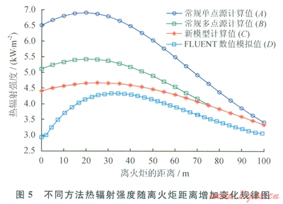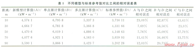 從圖5可以看出,4個(gè)計(jì)算結(jié)果值呈現(xiàn)出一樣的變化規(guī)律,在下風(fēng)向距離,隨著與火炬距離的增加,熱輻射強(qiáng)度呈現(xiàn)先增加后減少的趨勢。在不同距離取四者數(shù)值進(jìn)行對比,如表l所示,新模型計(jì)算結(jié)果與標(biāo)準(zhǔn)參考值之間的相對誤差除了在10m處為23.09%,其余在30m、50m、70m、90m處均低于l5%;常規(guī)單點(diǎn)源模型計(jì)算結(jié)果與標(biāo)準(zhǔn)參考值之間的相對誤差在不同距離處的波動(dòng)較大,在10m處,相對誤差較火(大于80%),隨著距離的變大,相對誤差有減小的趨勢,但在各點(diǎn)始終均大于新模型與標(biāo)準(zhǔn)參考值之間的相對誤差;而與新模型取相同點(diǎn)源數(shù)的常規(guī)多點(diǎn)源計(jì)算結(jié)果與標(biāo)準(zhǔn)參考值之間的相對誤差相比較于單點(diǎn)源計(jì)算值減小了許多,但在70m范圍內(nèi)相對誤差仍遠(yuǎn)大于新模型計(jì)算值,在70m范圍之外,常規(guī)多點(diǎn)源與標(biāo)準(zhǔn)參考值之間的相對誤差才達(dá)到可接受的l5%之內(nèi)??傮w來說,相比于與常規(guī)單點(diǎn)源和常規(guī)多點(diǎn)源計(jì)算結(jié)果,以數(shù)值模擬的結(jié)果為標(biāo)準(zhǔn)參照,新模型計(jì)算出的熱輻射強(qiáng)度有著更高的精度,同時(shí)計(jì)算復(fù)雜程度沒有提高很多,滿足工程使用的要求,可以在確定高架火炬安全距離得到很好的應(yīng)用與推廣。