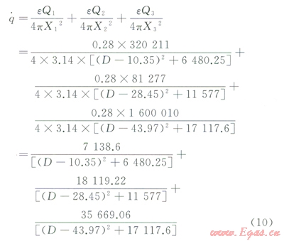 根據(jù)以上已知條件,按分區(qū)域 多點(diǎn)源模型的計(jì)算步驟進(jìn)行計(jì)算,其中火焰熱輻射率取0.28,得出在高架火炬下風(fēng)向水平面上距筒體距離為D m的目標(biāo)點(diǎn)接收射流火焰產(chǎn)生的熱輻射總通量(q),即