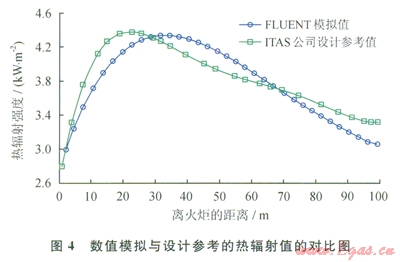 從圖4可以看出,在水平下風(fēng)向的熱輻射分布,數(shù)值模擬結(jié)果與設(shè)計(jì)計(jì)算參考結(jié)果隨著距火炬距離增加的變化趨勢一致,都是隨著距火炬距離的增加呈現(xiàn)先增加后減小的趨勢。從具體的對比數(shù)值來看,在29m范圍內(nèi),設(shè)計(jì)參考值略大于FLUENT模擬值,其中最大誤差為5.8%;在29~68m區(qū)間范圍內(nèi),FLUENT模擬值略大于設(shè)計(jì)參考值,其中最大誤差為4.8%;在68~100m區(qū)間范圍內(nèi),設(shè)計(jì)參考值又略大于FLUENT模擬值,其中最大誤差6.2%。綜上所述,以ITAS公司設(shè)計(jì)參考值為標(biāo)準(zhǔn),FLUENT的數(shù)值模擬結(jié)果與設(shè)汁參考值吻合得較好,在100m的空間范圍內(nèi),兩者的誤差均保持在10%以內(nèi)。即可以認(rèn)為FLUENT數(shù)值模擬結(jié)果的精確性是滿足要求的。