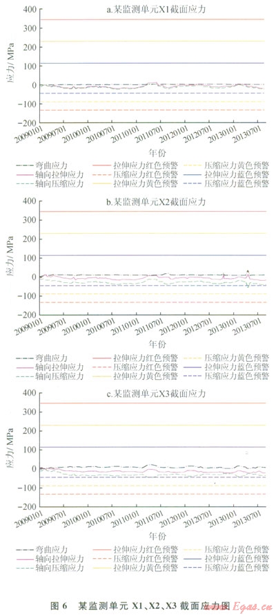 從系統(tǒng)監(jiān)測(cè)成果看,自2008年12月至今,應(yīng)變監(jiān)測(cè)Xl、X3截面軸向附加應(yīng)力未達(dá)到過(guò)預(yù)警閾值;應(yīng)變監(jiān)測(cè)X2截面在2013年4月1 5日因軸向附加壓應(yīng)力超過(guò)容許附加應(yīng)力的30%,曾出現(xiàn)過(guò)l次藍(lán)色預(yù)警。管道軸向附加應(yīng)力總體在溫差和輸送內(nèi)壓作用的合理范圍內(nèi)波動(dòng)。相關(guān)管道管理部門根據(jù)系統(tǒng)監(jiān)測(cè)成果,及時(shí)掌握了穿越活動(dòng)斷裂帶管道的力學(xué)狀態(tài)。