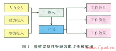 美國學(xué)者格朗蘭德認為,評價一測量(量的記述)或非測量(質(zhì)的記述)+價值判斷[20]。也就是說評價是在量(或質(zhì))記述的基礎(chǔ)上進行價值判斷的活動。管道完整性管理作為一種資源轉(zhuǎn)換系統(tǒng),通過一定的人、財、物的投入(量的記述),獲得一定的產(chǎn)出,如工作完成數(shù)量(量的記述)、工作完成質(zhì)量(質(zhì)的記述)和工作效果(質(zhì)的記述)等,最終達到管道風險可控、安全、經(jīng)濟運行的目的。對這種資源轉(zhuǎn)換系統(tǒng),筆者采用了經(jīng)典的評價模式——“生產(chǎn)函數(shù)”模式,即“投入產(chǎn)出”評價模式??紤]到數(shù)據(jù)的可獲得性與可操作性,舍去了一些對效能水平影響不大、非共性的因素,提出了如圖1所示的效能評價模式。