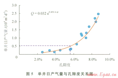 根據(jù)統(tǒng)計結(jié)果,氣層有效厚度取l5m,生產(chǎn)壓差設(shè)為5MPa,產(chǎn)能模擬實(shí)驗(yàn)結(jié)果如圖5所示??紫抖仍胶玫臍鈱?,單井日產(chǎn)量越高,兩者之間具有很好的正相關(guān)關(guān)系。當(dāng)孔隙度大于5.59%時,單井日產(chǎn)量能夠達(dá)到四川地區(qū)0.5×104m3/d的最低工業(yè)氣流標(biāo)準(zhǔn)。根據(jù)孔滲關(guān)系式,得到相應(yīng)滲透率下限為0.032mD。