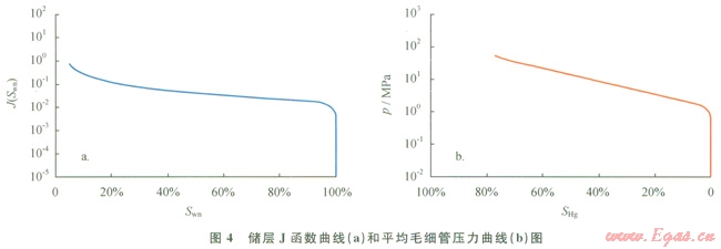 用J函數(shù)法對P地區(qū)須二氣藏4口井36塊巖心的壓汞資料進(jìn)行處理,得到J函數(shù)曲線(圖4-a)和儲層平均毛細(xì)管壓力曲線(圖4-b,圖中SAg為進(jìn)汞飽和度),再利用Purcell法和Wall法計算儲層的最小流動孔喉半徑。