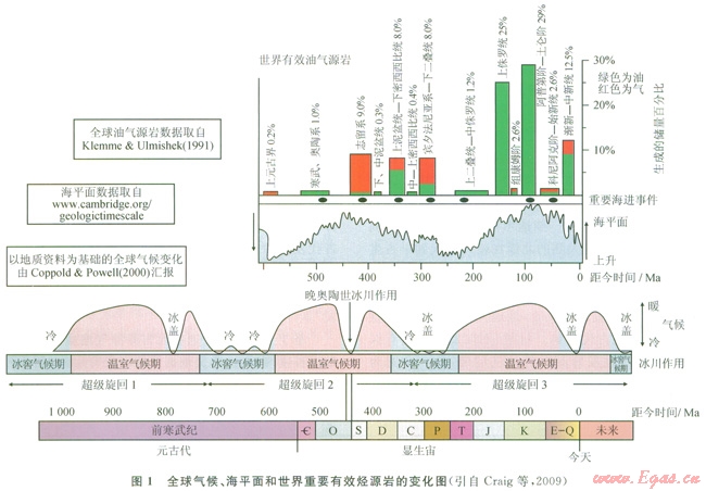 從烴源巖分布的角度考慮,不同時(shí)代全球氣候、海平而和源巖分布之間存在較好的對(duì)應(yīng)關(guān)系。Craig等人[1]研究距今l000Ma以來全球氣候變化、海平面和世界主要有效油氣源巖時(shí)代分布的對(duì)應(yīng)關(guān)系(圖1),指出高海平面期對(duì)應(yīng)于溫室氣候期,冰川融化導(dǎo)致海平面上升,有利于富有機(jī)質(zhì)沉積物堆積,是世界許多重要油氣源巖沉積的主要時(shí)期。如北非,志留系底部發(fā)育后冰川期烴源巖,直接覆蓋在上奧陶統(tǒng)儲(chǔ)層系之上,古生界含油氣系統(tǒng)的總儲(chǔ)量約為500×108桶油當(dāng)量[2]。