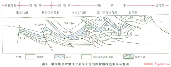 4)斜坡帶:斜坡帶即凹陷帶與前緣隆起之間的過(guò)渡地區(qū),在沉積構(gòu)造上均顯示為斜坡。如烏魯木齊前陸盆地從芳草湖—莫索灣為斜坡帶,庫(kù)車前陸盆地斜坡帶從秋里塔格牙南斷裂為斜坡帶,葉城前陸盆地從皮山北瑪扎塔克斷裂為麥蓋提斜坡帶等。