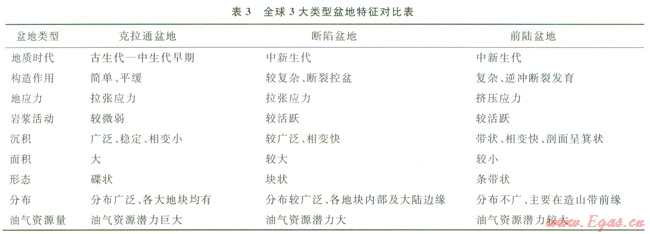 全球3大類型盆地的生成演化及結(jié)構(gòu)等方面特征有著明顯的區(qū)別[6-7]:①克拉通盆地一般發(fā)育在古生代和中生代早期,它的構(gòu)造較穩(wěn)定、巖漿活動(dòng)微弱,沉積面積大而廣泛,具有旋回性的特征,它是全球分布最廣的一種盆地類型;②斷陷盆地主要發(fā)育在中新生代,它是在拉張斷裂作用下形成的盆地,其沉積受斷裂控制,一般到盆地演化晚期轉(zhuǎn)化為凹陷型,故有的學(xué)者又稱之為斷凹盆地,在演化過(guò)程中常伴有巖漿活動(dòng),沉積相變快,這類盆地在全球分布較廣,主要發(fā)育在地塊內(nèi)和大陸邊緣地區(qū);③前陸盆地主要發(fā)育于中新生代,它主要是在壓性應(yīng)力作用下,造山帶擠壓逆沖形成的前陸凹陷,沉積物主要來(lái)源于相鄰的造山帶,盆地沉積剖面旱箕狀,相變快、厚度變化也大,在全球主要分布于各中新生代造山帶前緣,沿造山帶呈狹長(zhǎng)狀分布。至于三者的油氣資源豐度狀況,筆者認(rèn)為克拉通盆地優(yōu)于斷陷盆地,前陸盆地相對(duì)較差(表3)。