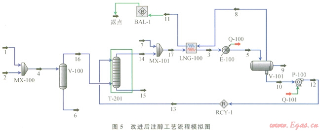 圖5為采用HYSYS軟件對改進后注醇工藝流程模擬示意圖。