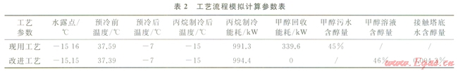 現(xiàn)用注醇工藝流程模擬與改進后注醇工藝流程模擬原料氣的溫度、壓力、流量以及原料氣組成完全相同,而且保持板翅換熱器與丙烷蒸發(fā)器的溫降也相同。與此同時,現(xiàn)用注醇工藝與改進后注醇工藝外輸干氣的露點分別為-l5.16℃和-15.15℃,幾乎相同,在保證沒有天然氣水合物形成、取最小注醇量的基礎上對兩種工藝進行對比分析,工藝參數(shù)對比見表2。