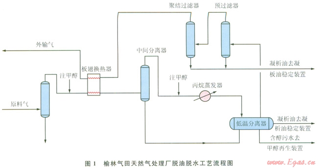 中國石油長慶油田公司榆林氣田(以下簡稱榆林氣田)天然氣處理廠采用低溫分離法進行脫油、脫水,使天然氣的水含量、烴露點符合商品天然氣質(zhì)量指標和管道輸送要求[1-2]。其工藝流程如圖1所示。