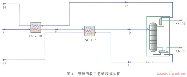 圖3、4分別為采用HYSYS軟件對現(xiàn)用注醇工藝和甲醇回收工藝流程模擬示意圖。