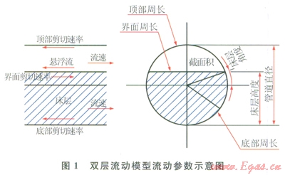 應(yīng)用以上模型,對(duì)于給定的系統(tǒng)參數(shù)(顆粒直徑、顆粒密度、顆粒平均濃度、連續(xù)相密度、連續(xù)相黏度、連續(xù)相平均流速以及管線直徑),結(jié)合式(1)~(6)求解即可得到兩相流動(dòng)狀態(tài)及流動(dòng)參數(shù)。雙層流動(dòng)模型流動(dòng)參數(shù)如圖l所示。