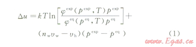 式中Du為過飽和度,J;DGexp為吉布斯自由能的變化量;pep為相平衡壓力,MPa;pexp為實驗條件下的壓力,MPa;R為氣體常數(shù),kJ/(mol·K);T為系統(tǒng)溫度,K;k為波爾茲曼常數(shù);nw為水合數(shù);uw為水分子的體積,m3;uh為單個水合物晶胞的體積與平衡壓力下所含有的氣體分子數(shù)的比值,m3;nk為氣體分子的數(shù)量;¦keq為相平衡條件下k組分氣體的逸度系數(shù);¦kexp為實驗條件下k組分氣體的逸度系數(shù);jeq為相平衡條件下氣體的逸度系數(shù);jexp為實驗條件下氣體的逸度系數(shù)。