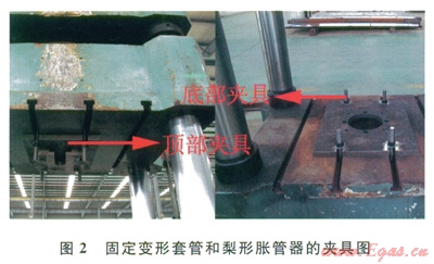 3)在萬能液壓試驗機(YS32-500)上安裝與梨形脹管器和變形套管相匹配的頂部、底部夾具(圖2)。