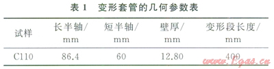 該實驗主要分為2個階段,第1個階段是橢圓形套管的制備,其方法是將理想套管(C110×177.8×12.65)放在YAW-200壓力試驗機上進行壓扁實驗(圖l-a),變形尺寸是基于現(xiàn)場套管變形數(shù)據(jù)(表1);第2階段是用3只不同外徑的梨形脹管器對變形套管的整形測試,該實驗在YS32-500型的四方柱萬能液壓試驗機上完成(圖l-b)。