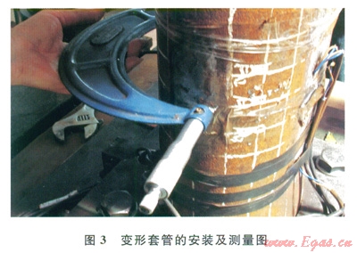 6)開始整形測試(圖5)。在整形的過程中要求梨形脹管器在套管變形處往得移動直到配合接頭上的壓應(yīng)變趨于0為止,即梨形脹管器可以在變形套管內(nèi)自由滑動,此時我們可以認為變形套管的內(nèi)徑等于梨形脹管器的最大外徑,同時測量變形套管整形后的尺寸,完成l只梨形脹管器的整形實驗;第2只和第3只梨形脹管器重復(fù)上述步驟完成。