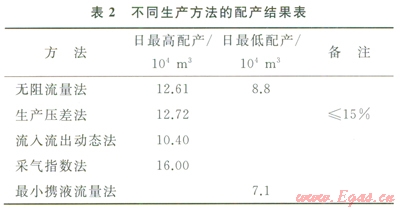 氣井的最小攜液產(chǎn)量也是配產(chǎn)的重要考慮參數(shù)。該參數(shù)用以保證氣井生產(chǎn)時(shí)井筒不產(chǎn)生積液。臺(tái)H2-1井分別采用73mm、60.3mm、48.3mm這3種規(guī)格的油管進(jìn)行模擬計(jì)算,得出其最小臨界攜液日產(chǎn)量分別為7.1×104m3、4.9×104m3和3.2×104m3。目前該井使用的為73mm油管,確定其最小臨界攜液流量為7.1×104m3/d。通過以上幾種方法配產(chǎn)方法,其匯總結(jié)果如表2所示。