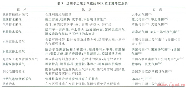 我國邊底水氣藏大多數(shù)已進(jìn)入開發(fā)中后期階段,面臨水侵現(xiàn)象嚴(yán)重,而采取人工排水采氣技術(shù)更應(yīng)注意各種排水工藝的技術(shù)特點以及適應(yīng)條件,以便取得最好的排水效果。通過多年的研究和發(fā)展,目前國內(nèi)外都已形成了各自的提高邊底水氣藏采收率的技術(shù)。其針對邊底水氣藏的EGR技術(shù)策略總結(jié)如表3所示。