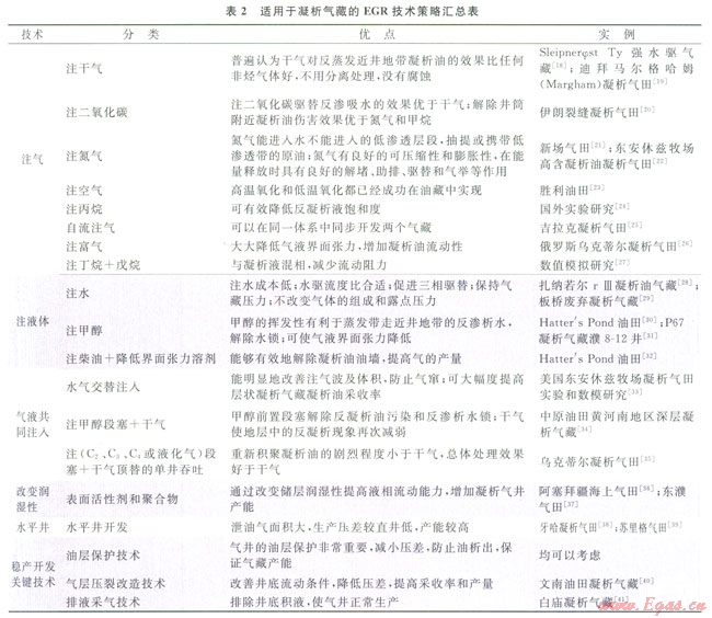 6)表2中雖然列出了現(xiàn)發(fā)表的EGR技術(shù),有些還處于評價研究階段,還未投入現(xiàn)場應(yīng)用,應(yīng)用時要針對具體的氣藏情況,考慮現(xiàn)有技術(shù)和經(jīng)濟條件來確定是否值得實施。