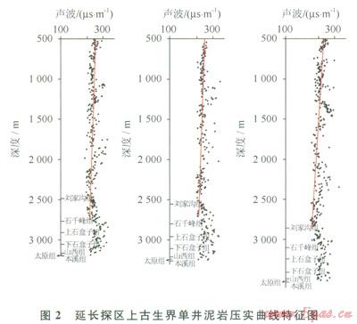 該區(qū)上古生界發(fā)育2套區(qū)域性蓋層:①下二疊統(tǒng)太原組海相石灰?guī)r,厚度介于15~45m,分布穩(wěn)定,也是本溪組的直接蓋層;②上石盒子組與石干峰組發(fā)育的泥質(zhì)巖系,厚度介于l50~350m,分布穩(wěn)定,橫向連續(xù),是山西組~下石盒子組氣藏的重要蓋層。對該區(qū)上古生界泥巖的壓實(shí)研究表明,聲波時(shí)差明顯高于正常壓實(shí)趨勢(圖2),表明上古生界普遍存在古超壓現(xiàn)象[11-13],其過剩壓力介于5~20MPa,最大過剩壓力出現(xiàn)在上石盒子組—石千峰組,組成上古生界壓力封存箱的箱頂,天然氣很難突破箱頂超壓體而在箱內(nèi)成藏[14-15]。前人的研究也表明[16-19],鄂爾多斯盆地上古生界匕石盒子組與石干峰組泥巖封蓋性能優(yōu)越,具有物性封閉和壓力封閉雙重封閉特征。