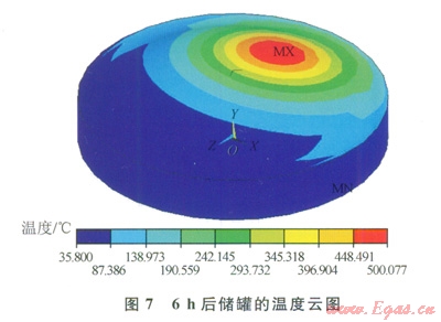 火災發(fā)生6h時后,穹頂?shù)耐獗砻鏈囟纫呀?jīng)升高到了500℃左右,同時高溫區(qū)域也增大了很多(圖7)。