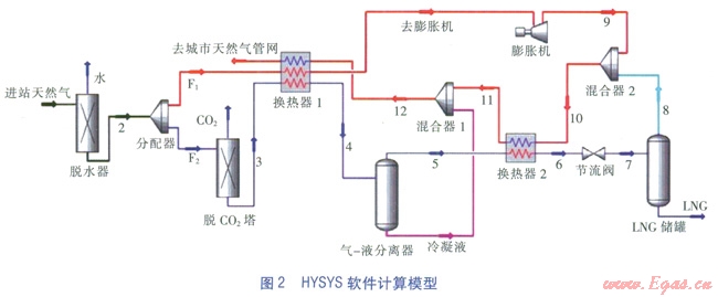 通往膨脹機(jī)的膨脹氣流F1經(jīng)過換熱器l后溫度降低,然后進(jìn)入膨脹機(jī)膨脹降溫降壓,與LNG儲罐排出的低溫天然氣匯合后通過換熱器2,然后與氣一液分離器分離出的冷凝液混合后通過換熱器1,為液化氣流F2提供冷量后溫度升到常溫,進(jìn)入城市管網(wǎng)(圖1中紅色線條部分)。