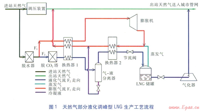 來自長輸管道的天然氣已進(jìn)行一定程度的凈化處理,要達(dá)到液化天然氣氣質(zhì)及制冷過程的要求,還需要進(jìn)行脫水以及脫CO2處理。天然氣部分液化調(diào)峰型LNG生產(chǎn)工藝流程見圖l。