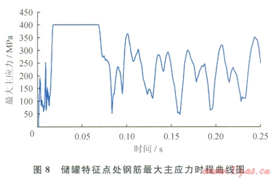 儲罐部分特征點(diǎn)B處鋼筋最大主應(yīng)力時程曲線如圖8所示,由于爆心處A點(diǎn)的鋼筋瞬間即達(dá)到設(shè)定的應(yīng)變極限不具代表性,故此處并未示出。圖8顯示B點(diǎn)的鋼筋一直處于較高的應(yīng)力水平,最大應(yīng)力已達(dá)到400MPa,但是未達(dá)到設(shè)置的應(yīng)變極限0.05,故尚未破壞,初始爆炸沖量并未使其到達(dá)應(yīng)力極值,后續(xù)的空氣沖擊波持續(xù)作用使其應(yīng)力逐漸增加。外罐鋼筋除爆心處發(fā)生破壞外,其余部分即使有瞬間到達(dá)應(yīng)力限值,但未達(dá)到設(shè)定的應(yīng)變極限,總體來說,外罐鋼筋應(yīng)力響應(yīng)較安全。