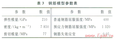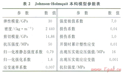混凝土采用Johnson-Holmquit本構(gòu)模型,模型參數(shù)見表2。該模型因綜合考慮了損傷、應(yīng)變率、靜水壓以及壓碎、壓實(shí)效應(yīng),適合大應(yīng)變、高應(yīng)變率和高靜水壓情況,被廣泛地應(yīng)用于混凝土撞擊、侵徹和爆炸等強(qiáng)動載問題的數(shù)值模擬。鋼筋材料模型采用雙線性隨動硬化模型,用兩個斜率(彈性和塑性)來表示鋼筋的應(yīng)力應(yīng)變特性,具體參數(shù)見表3。