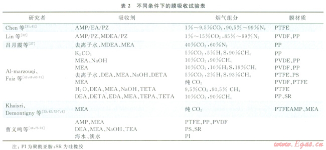 此外,由于單一吸收劑不能完全滿足高再生性能與高吸收速率,研究者們在混合吸收劑的探索中取得了較大進(jìn)展。常用的活化添加劑有醇胺、烯胺以及脂肪胺等。Wongrong等[58]發(fā)現(xiàn)在MEA中添加甘氨酸鈉溶液吸收效果有較大改善。Chen等[59]考察了6種不同配比的MEA/MDEA和PG/MDEA混合液,發(fā)現(xiàn)當(dāng)MDEA在混合液中比例為3:2時(shí),脫除效率可達(dá)99%,并且反應(yīng)更持久。楊波等[60]在氨基酸鉀中加入活化劑哌嗪(PZ)后,捕集濃度為15%的CO2模擬煙氣,CO2脫除率得到不斷提升。晏水平[53]通過大量實(shí)驗(yàn)研究了不同配比混合吸收劑的吸收與再生性能,發(fā)現(xiàn)在三級胺溶液中添加中等含量活化劑時(shí)性能最佳。表2總結(jié)了部分國內(nèi)外學(xué)者進(jìn)行膜吸收試驗(yàn)的條件及參數(shù)。綜上所述,MEA/TEA、PZ/TEA、MEA/MDEA、PZ/MDEA、MEA/AMP、PZ/AMP和PZ/DEA等混合吸收劑體現(xiàn)了良好的綜合性能。因此,采用具有高CO2吸收和再生性能的吸收劑組成的混合吸收劑理論上能獲得較好的CO2吸收與再生綜合性能。所以,在規(guī)?;瘧?yīng)用中,應(yīng)當(dāng)根據(jù)實(shí)際情況進(jìn)行適當(dāng)?shù)蛘?,確定最優(yōu)的活化劑種類與濃度,達(dá)到最佳吸收效果,找到一種高效吸收與再生的吸收劑。