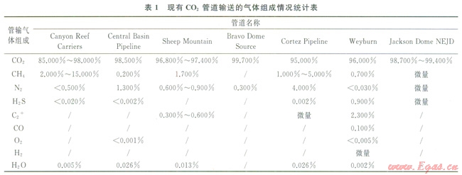 CO2管道輸送的混合氣體組成取決于它的來源。來自不同源頭的CO2流體接入管道設(shè)施中時(shí),管道內(nèi)混合氣體組成會(huì)發(fā)生變化。不同的捕捉技術(shù)也會(huì)導(dǎo)致CO2混合氣體中產(chǎn)生不同的化合物,目前CO2輸送中這方面的經(jīng)驗(yàn)較少。