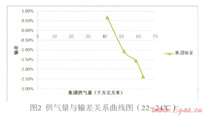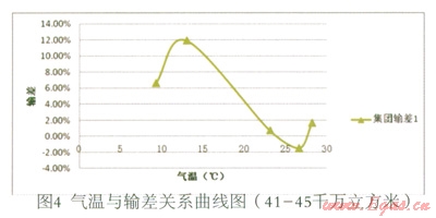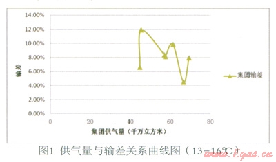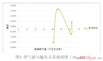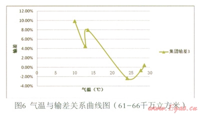 (3)在現(xiàn)有數(shù)據(jù)基礎(chǔ)上,暫未發(fā)現(xiàn)供氣量與輸差之間的明顯函數(shù)關(guān)系。但是,從圖8觀察發(fā)現(xiàn),輸差曲線1、2、3(修正)對(duì)應(yīng)的供氣量依次為:41—45、56—60、61—66,單位千萬立方米。隨著供氣量的大幅上升,輸差曲線呈向左下方平移的趨勢(shì)。即溫度等其他條件一定的情況下,隨著供氣量的大幅增加,輸差有減小的趨勢(shì)。初步分析,可能是由規(guī)模效應(yīng)導(dǎo)致。此推斷是否成立有待進(jìn)一步的研究,可做為下一研究課題。