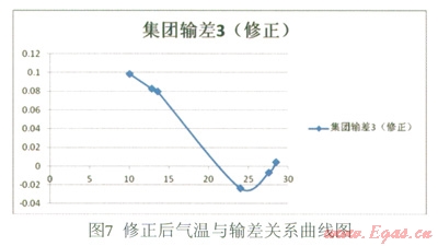 由圖9可知,輸差存在極值,不會(huì)永遠(yuǎn)增大或減小。對(duì)回歸方程求導(dǎo)可得:y=0.033x2-1.242x+10.260,令其等于零則可以得出函數(shù)的極值為:x1=12.35,x2=24.95。將x代入回歸方程可以求得對(duì)應(yīng)的輸差分別為:y1=9.62,y2=2.84。因此,輸差的極大值應(yīng)該出現(xiàn)在12℃左右為9.62左右,極小值應(yīng)該出現(xiàn)在25℃左右為-2.84左右。