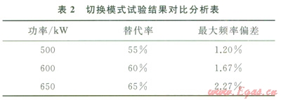 4)切換模式對(duì)比分析。分別在500kW、600kW和650kW 3種工況下,進(jìn)行天然氣切斷時(shí)的響應(yīng)測(cè)試,最大頻率偏差2.27%,小于國家標(biāo)準(zhǔn)5%。分別在500kW(替代率55%)、600kW(替代率60%)和650kW(替代率65%)工況下,GTI機(jī)組頻率增加均沒有超過l%。試驗(yàn)結(jié)果表2所示。