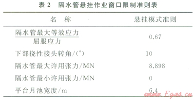 在計算隔水管懸掛作業(yè)窗口時,同樣也需要首先明確隔水管懸掛作業(yè)窗口的限制準則,參考相關研究成果[6,11],確定的隔水管懸掛作業(yè)窗口限制準則見表2。