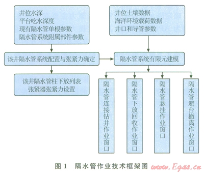 從指導隔水管作業(yè)的角度出發(fā),作業(yè)技術研究的目的是要確定鉆井作業(yè)窗口和隔水管下放/回收窗口和隔水管懸掛作業(yè)窗口,也就是確定各種作業(yè)條件下的容許作業(yè)參數(shù)和環(huán)境條件,為隔水管的安全作業(yè)提供參考。深水鉆井隔水管作業(yè)技術框架如圖l所示。