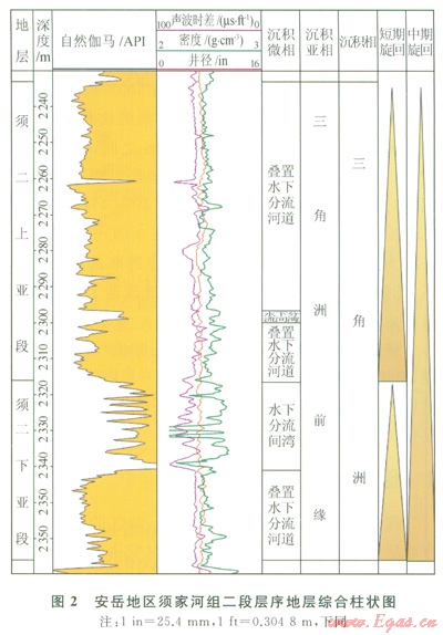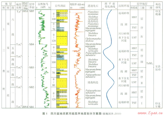 四川盆地川中地區(qū)須家河組劃分為4個(gè)三級(jí)層序,每個(gè)層序可進(jìn)一步識(shí)別出低位、水進(jìn)和高位3個(gè)體系域,其中低位體系域以三角洲相為主,水進(jìn)和高位體系域則以湖泊相為主,該區(qū)須二段總體上位于低位體系域[4](圖1)。
