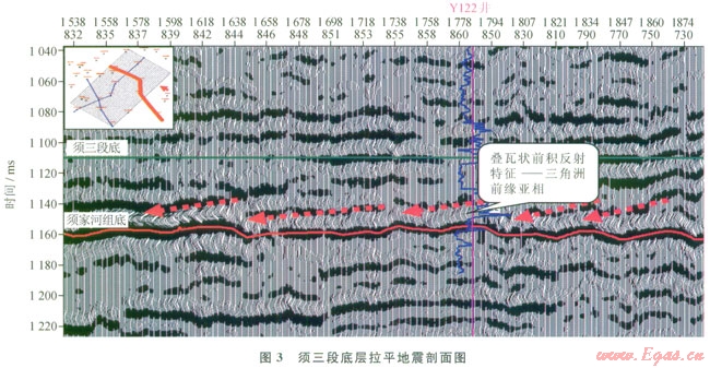 地震相主要是通過地震反射外部幾何形態(tài)、內(nèi)部反射結(jié)構(gòu)、振幅、連續(xù)性、波形排列以及視頻率等特征進(jìn)行識(shí)別與劃分。在區(qū)域最大湖泛面(須三段底)拉平地震剖面上,對于整個(gè)須二段可見清晰的三角洲前緣亞相疊瓦狀前積反射結(jié)構(gòu),兩個(gè)平行的反射層之間存在幾組傾斜的、疊瓦狀排列的同相軸(圖3),可作為判斷物源方向的依據(jù)。但對該區(qū)須二上亞段20~30ms小時(shí)窗內(nèi)(厚度50~85m),地震微相特征不明顯,后續(xù)沉積微相的劃分需要借助地震屬性的分析。