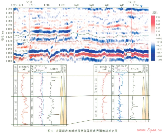 由于河湖相地層橫向變化大,而層序界面的追蹤對比必須是等時(shí)的、精細(xì)的,因此,在單井層序劃分的基礎(chǔ)上,以區(qū)內(nèi)8口典型井合成地震記錄為橋梁,以波形、波組特征以及能量的相關(guān)性為識(shí)別依據(jù),在高分辨率處理的地震資料上進(jìn)行層序界面的對比追蹤,最終建立該區(qū)須二段等時(shí)地層格架,確保了后續(xù)地震屬性的準(zhǔn)確提取。圖4是以Y5、GKl井為例的連井解釋剖面。